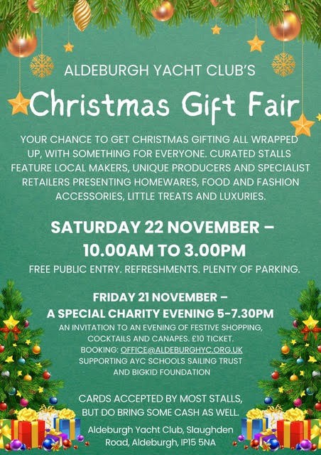 fr 21 Nov 2025 | This evening at Aldeburgh Yacht Club charitable Christmas shopping with cocktails and canapés, tomorrow more shopping but with free entry.